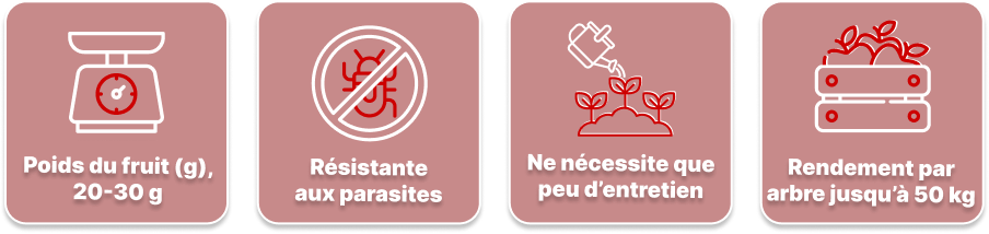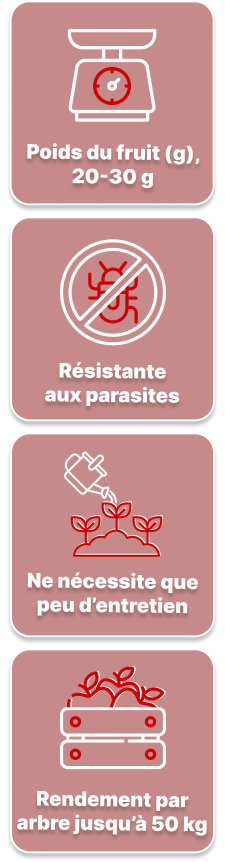 « Giant RED » est une variété à maturation tardive, récoltée en juin, prolongeant ainsi la saison des cerises dans votre jardin. Les arbres sont très productifs, avec une récolte pouvant atteindre 50 kg par arbre adulte. De plus, « Giant RED » est peu exigeante en termes de sol, pouvant croître même sur des terrains sableux, et offre une bonne résistance aux maladies et aux ravageurs. Ces caractéristiques en font un choix idéal pour les producteurs commerciaux et les jardiniers particuliers.