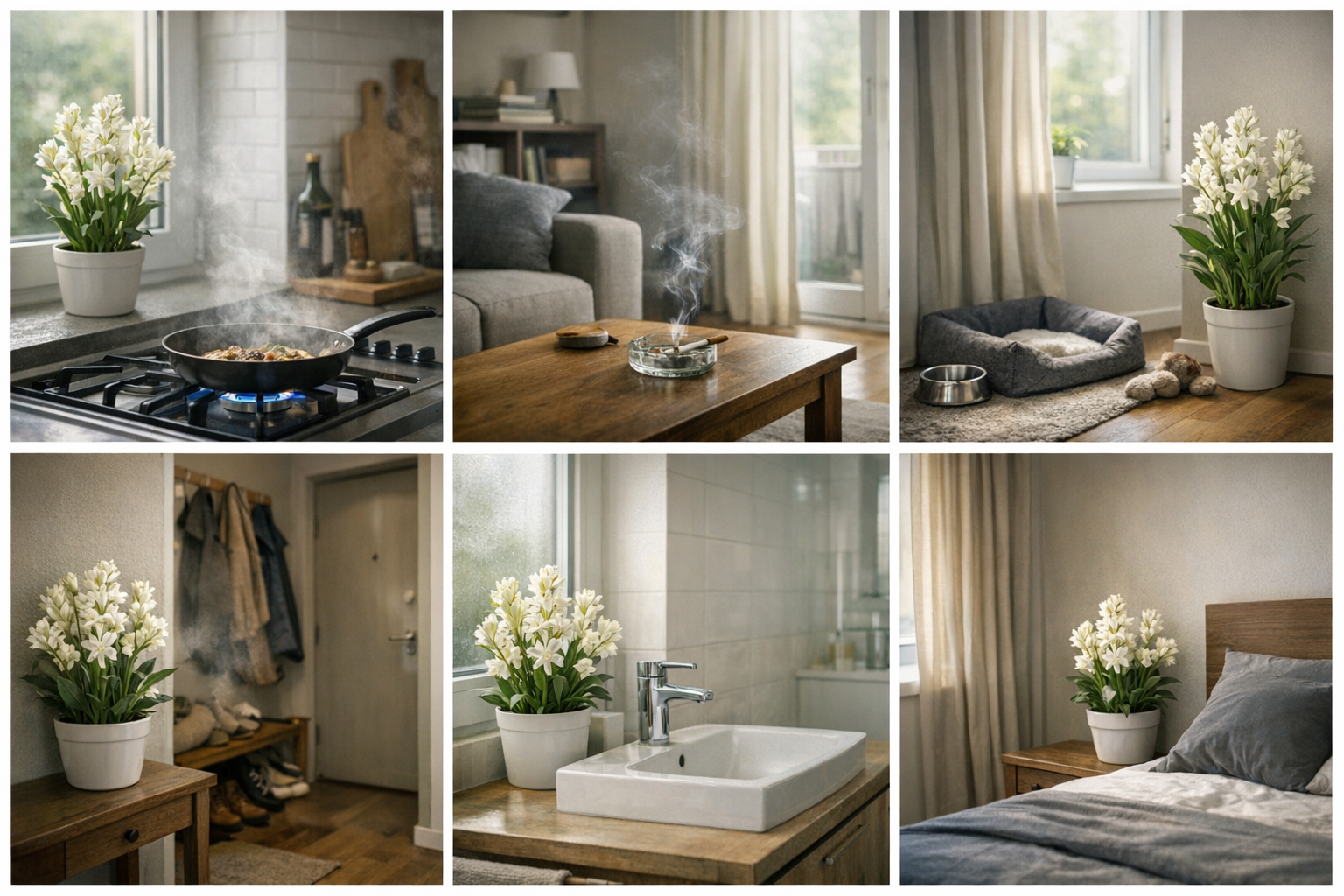 Тубероза не просто добавляет приятный аромат — она перекрывает и приглушает неприятные бытовые запахи, которые накапливаются в квартире. Благодаря насыщенному, но мягкому природному запаху, воздух воспринимается более чистым и свежим, без резких нот и химии.