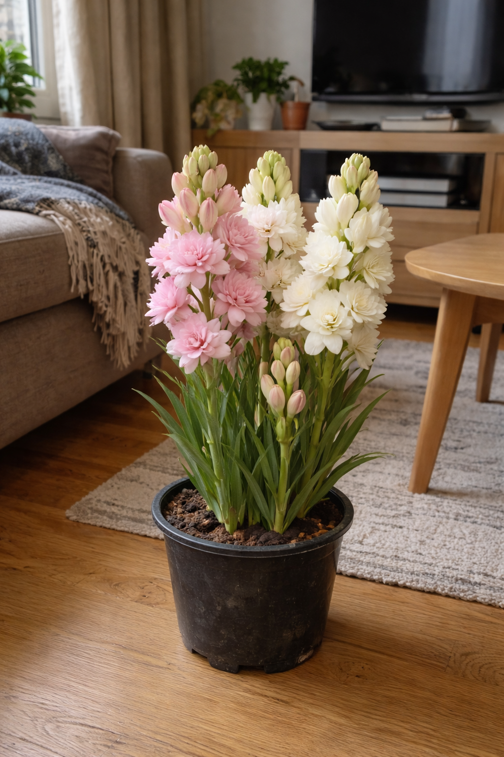 Растение простое в выращивании: любит светлое место, умеренный полив и обычный грунт. После комнатного выращивания туберозу можно пересадить в открытый грунт, где она продолжит расти как садовое растение. Это делает ее не одноразовой покупкой, а полноценным цветком на годы вперед.