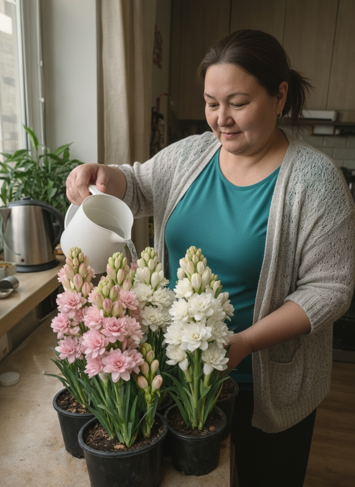 После посадки важно не заливать водой — тубероза этого не любит. Поливать нужно тогда, когда верхний слой почвы подсох. Температура — обычная комнатная, без сквозняков. При таких условиях растение быстро приживается и начинает активно расти, а цветение появляется уже через несколько недель.