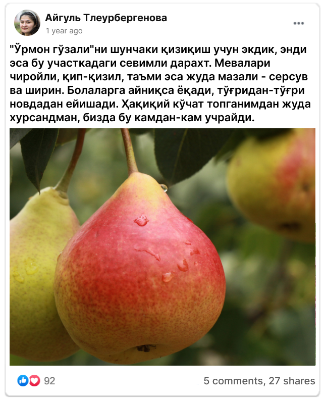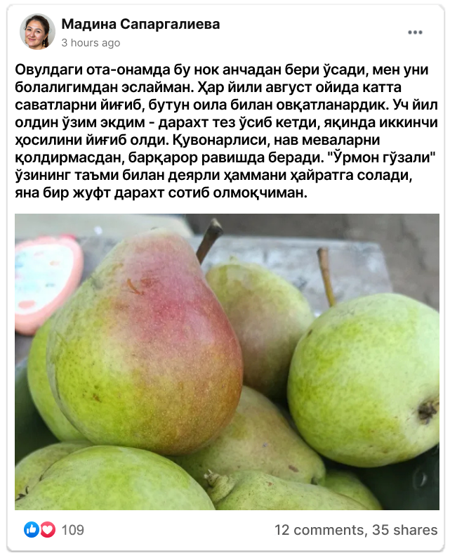| ҲОСИЛДОРЛИК | Ёш дарахт 20 кг гача, катта дарахт 160 с/га гача |