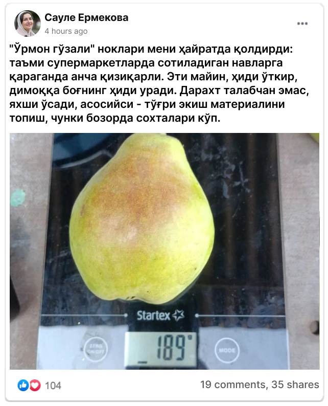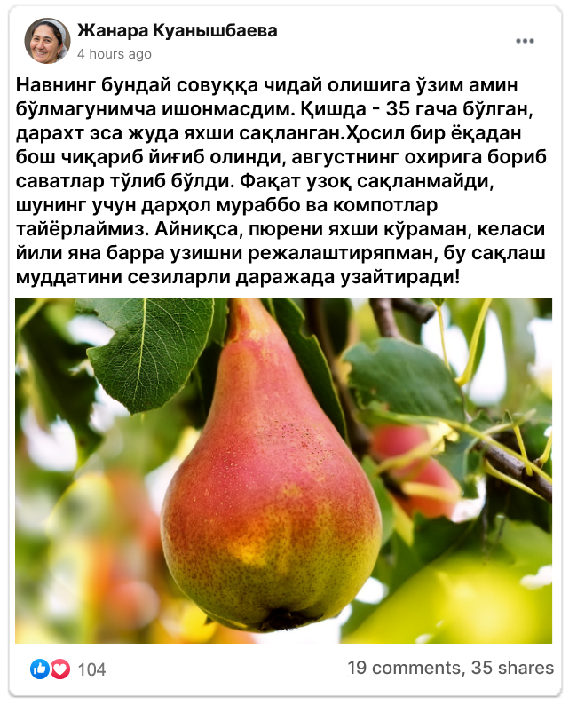 | МЕВАЛАРНИНГ ҲАЖМИ ВА ВАЗНИ | 120-200 грамм, баъзи мевалар 250 граммгача |
