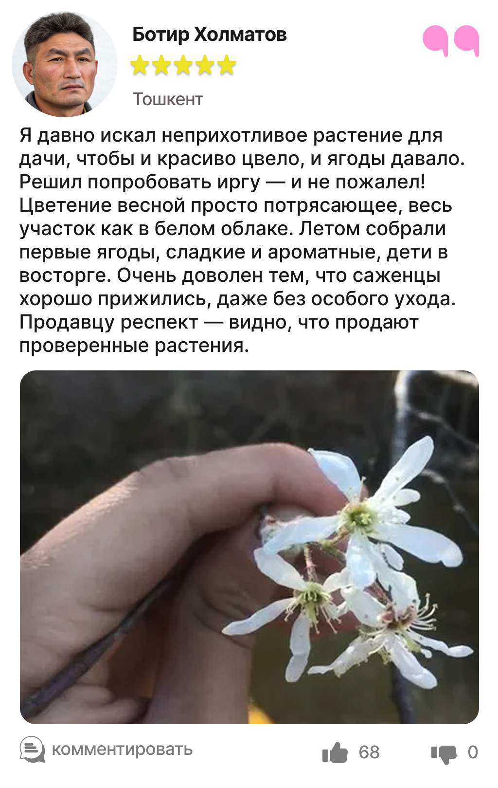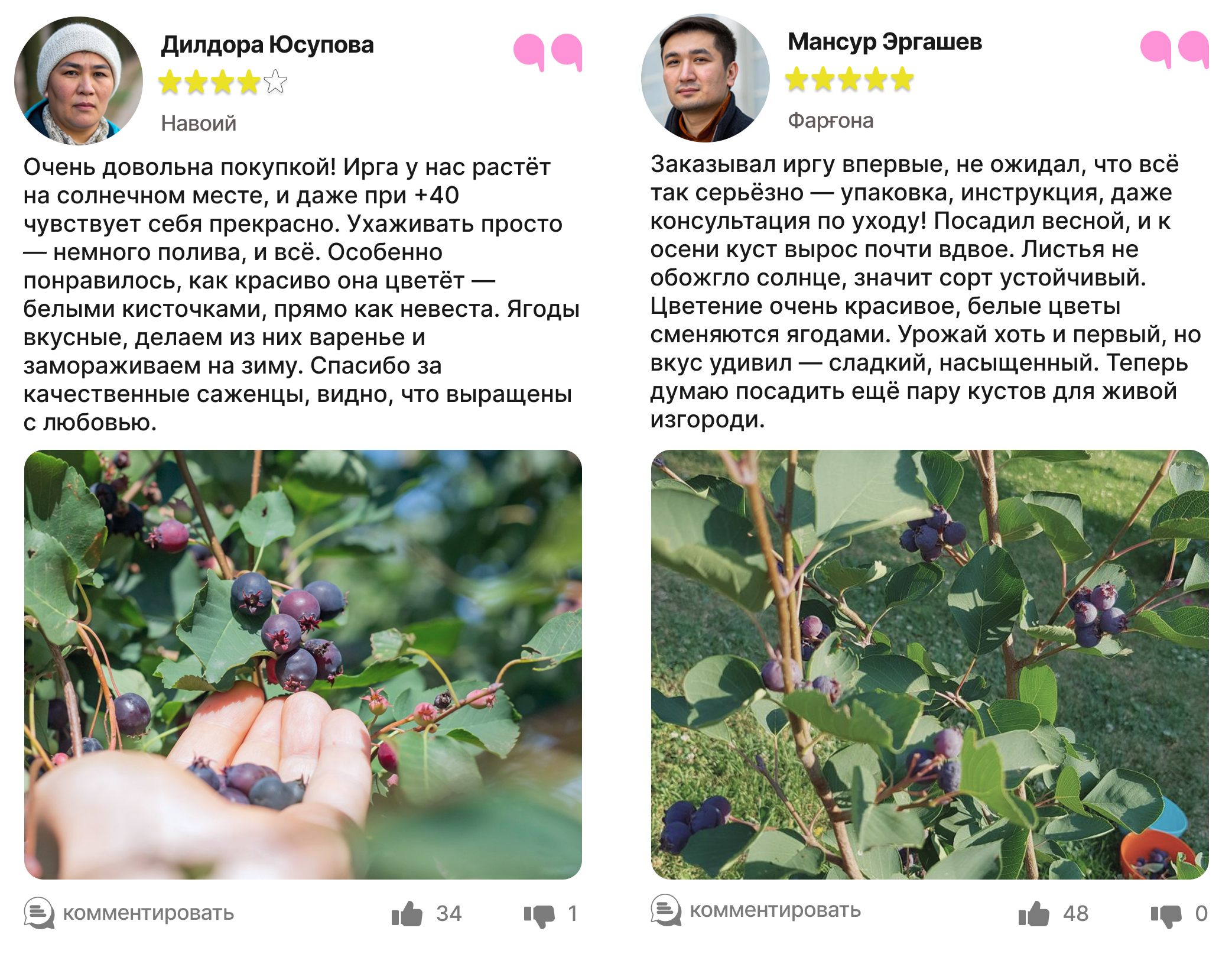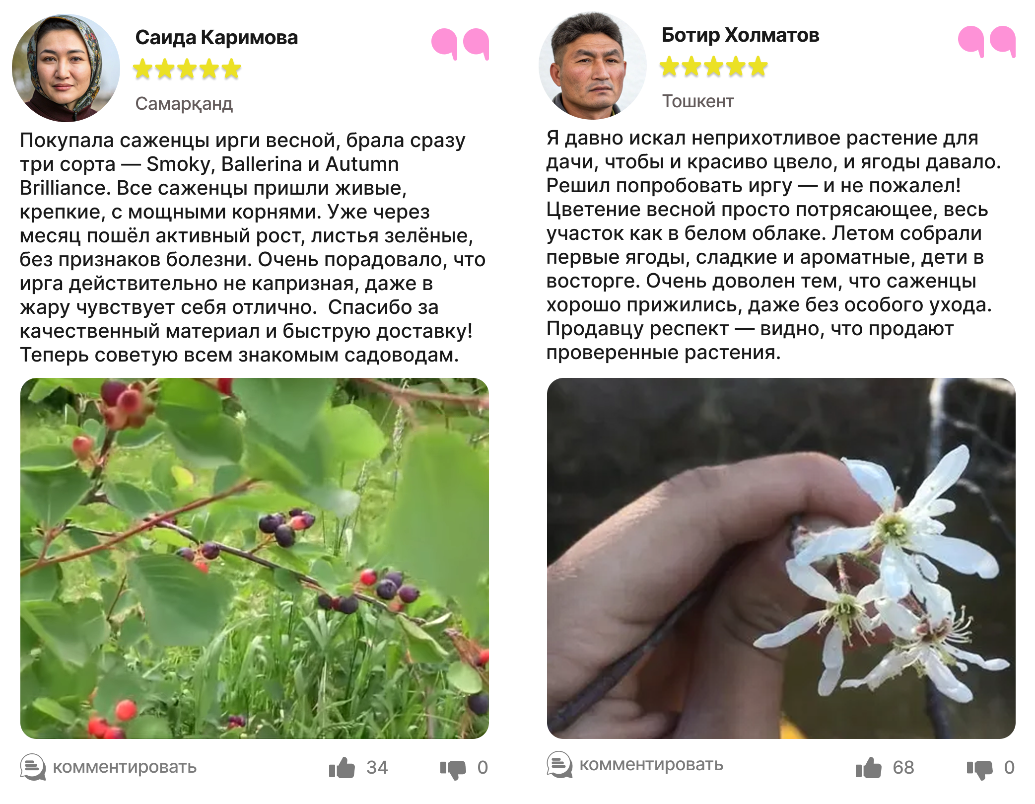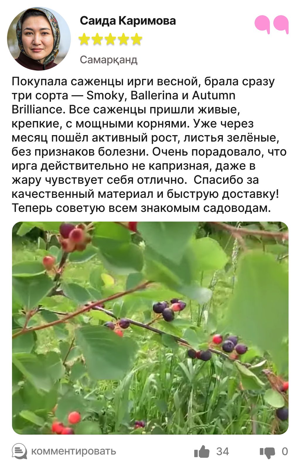 Харидорларимиз сотиб олинган ва етиштирилган ирга кўчатлари ҳақидаги таассуротлари билан ўртоқлашмоқда.