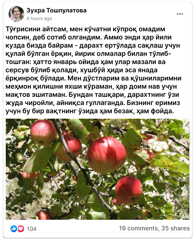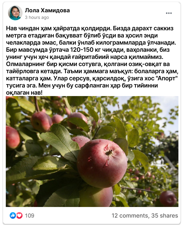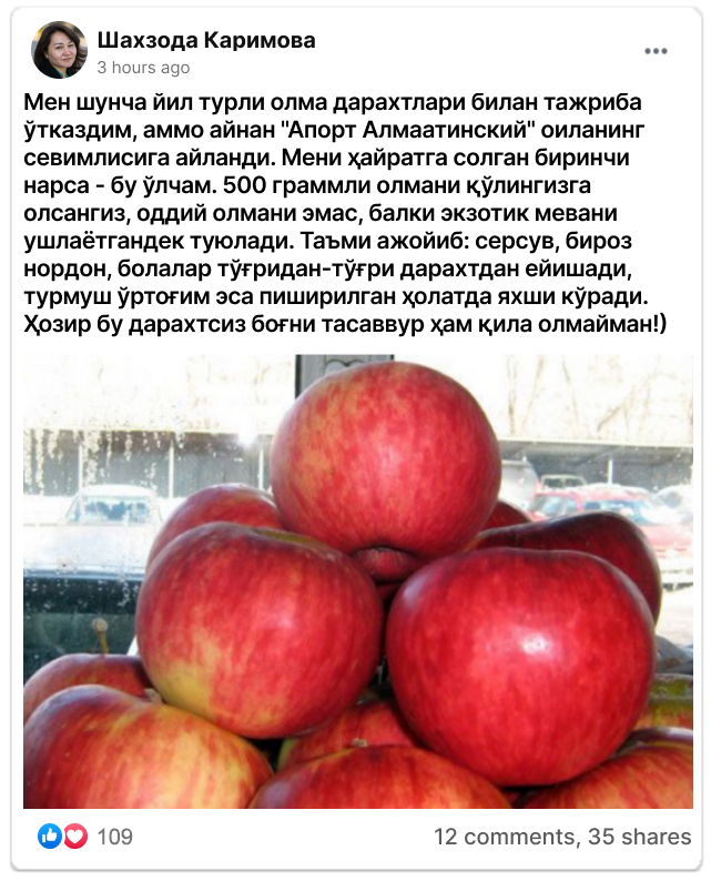 Ўзбекистоннинг барча ҳудудларида яхши кўкарадиган ва ҳосил берадиган олма дарахти!
