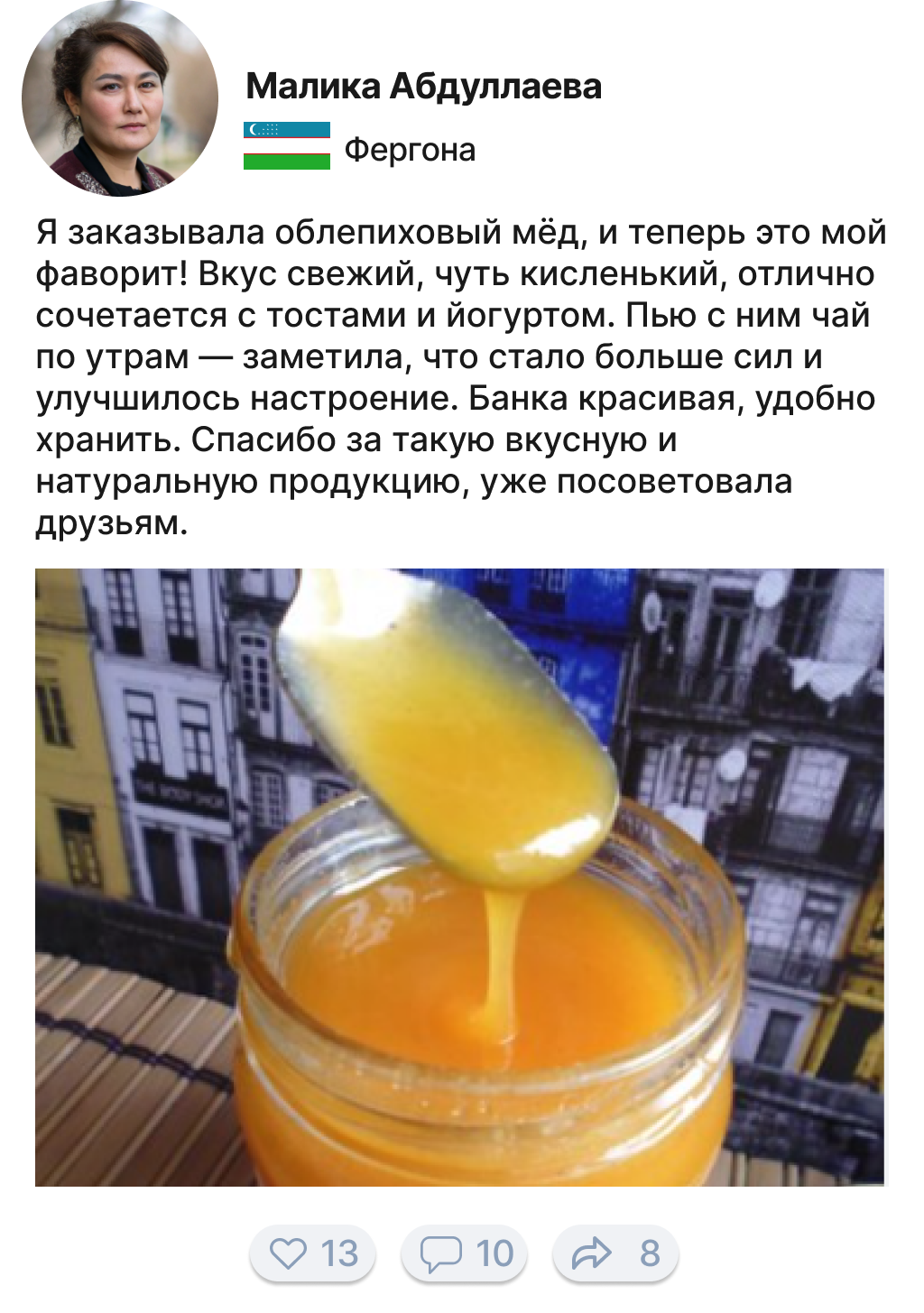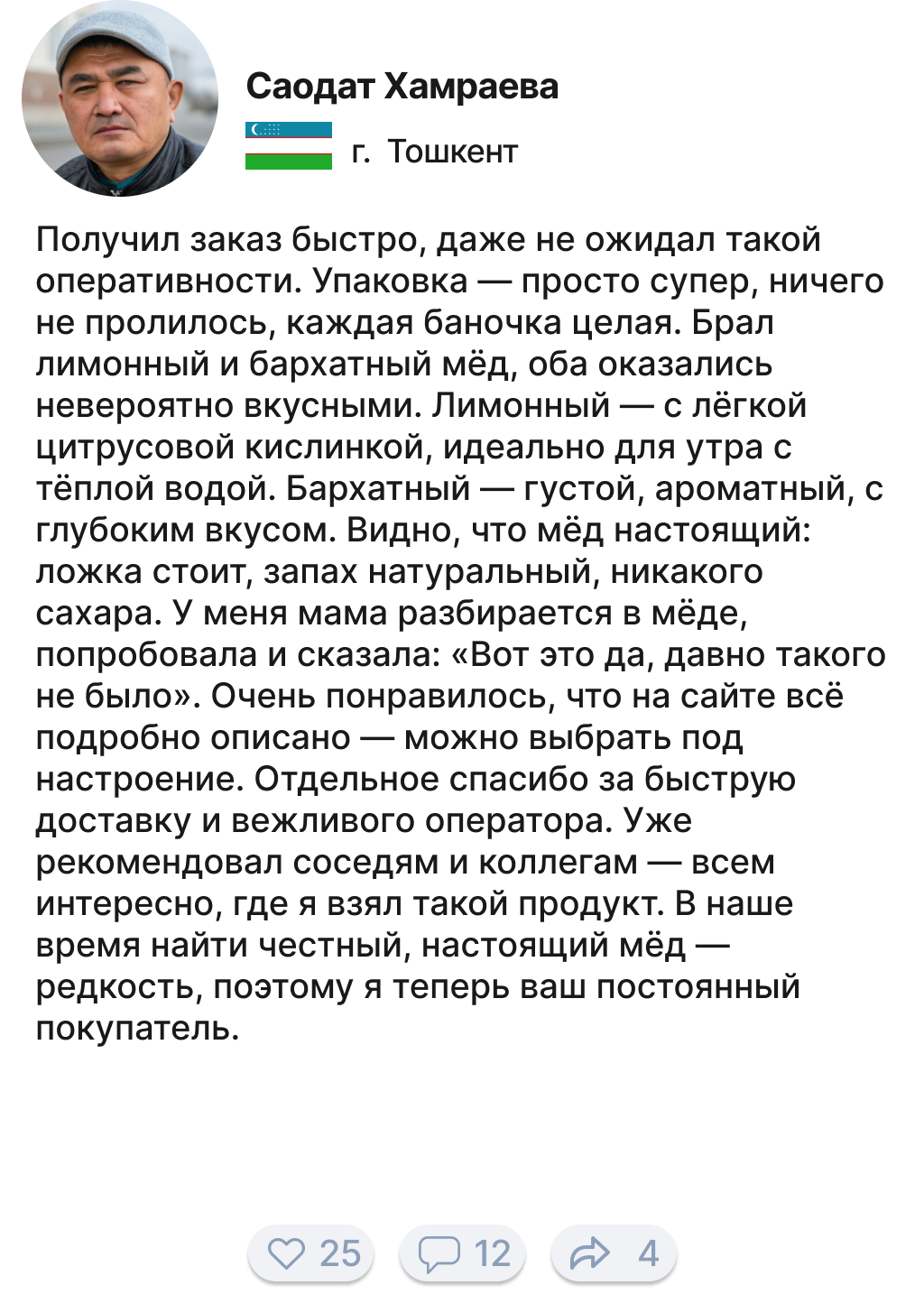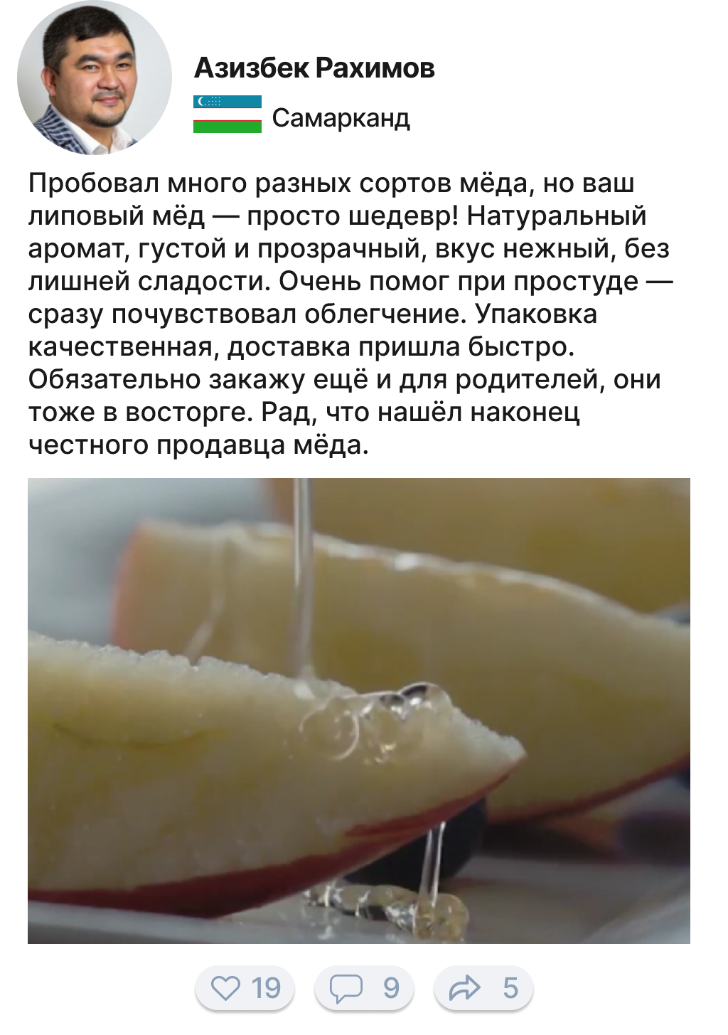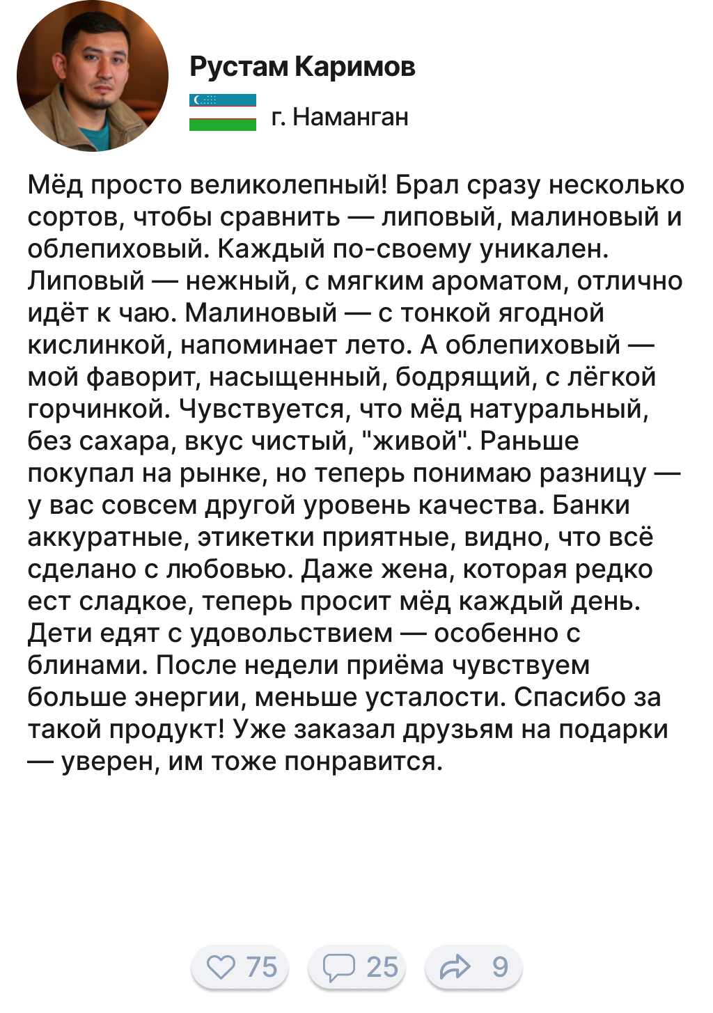 Биз нафақат Ўзбекистонда, балки ундан ташқарида ҳам қадрланадиган ҳақиқий премиум сифатли Россия асалини етказиб берамиз.