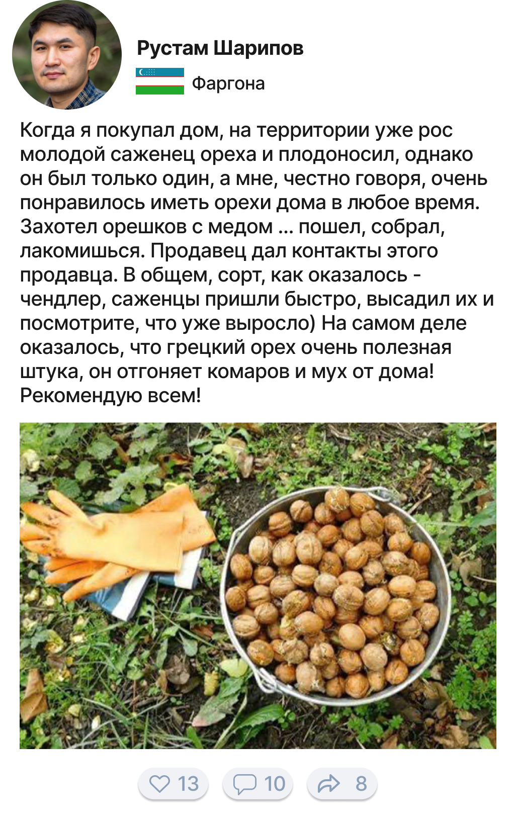 Агар сизда бўш ер бўлса ва сиз нима экишни, нима билан шуғулланишни ўйлаётган бўлсангиз, ўз бизнесингизга ва ҳар йили яхши даромадга эга бўлишни орзу қилсангиз ёки шунчаки томорқангизга нима экишни ўйлаётган бўлсангиз, унда ёнғоқ кўчатларини экиб - сиз тўғри нишонга тегасиз!