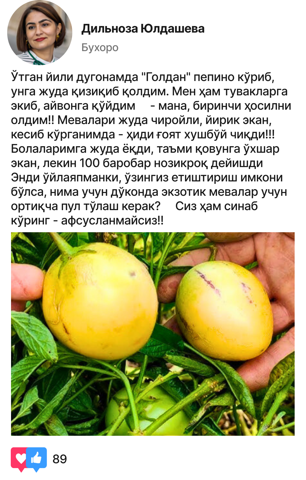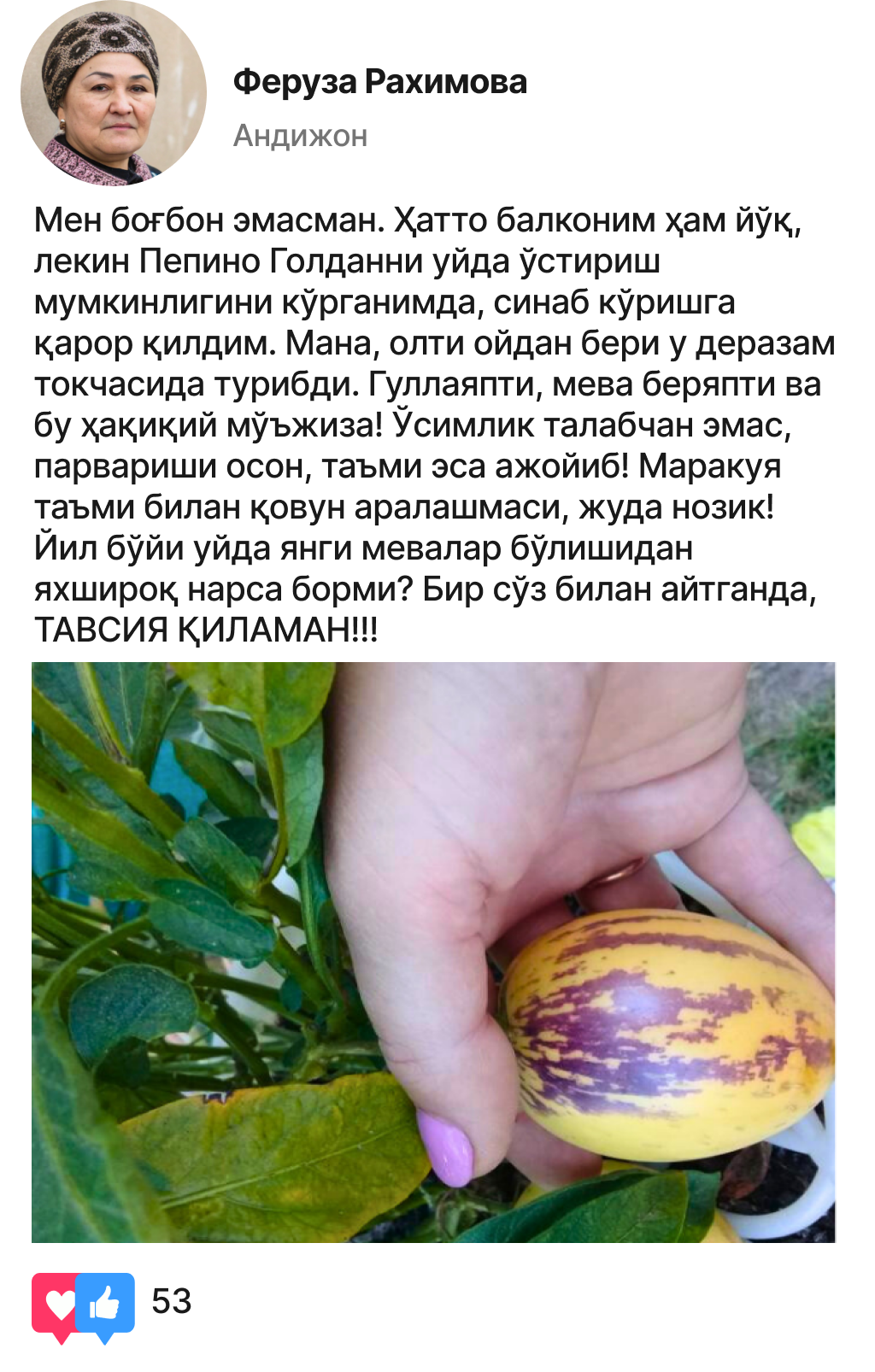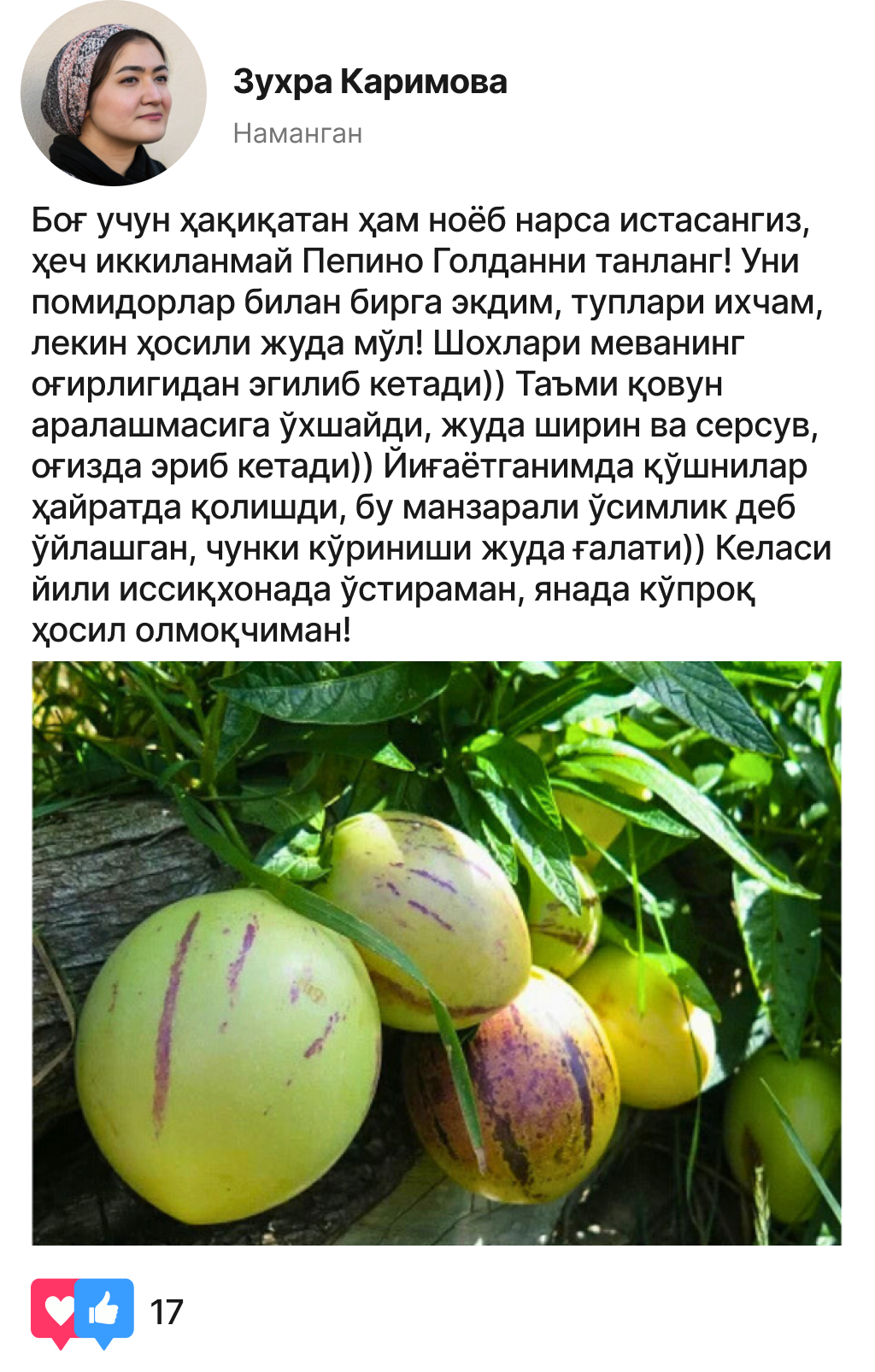 Боғбонлар "Голдан" навли пепино ҳақидаги фикр-мулоҳазалари билан бўлишишади: